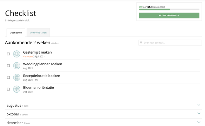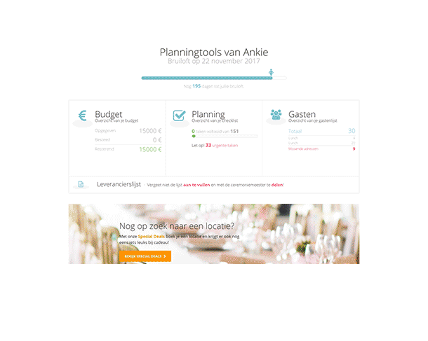 Binnen 10 seconden sluit je je aan bij de 202999 andere bruidsparen die onze planningtools gebruiken voor een perfect georganiseerde bruiloft. Onze planningtools bestaan onder meer uit: