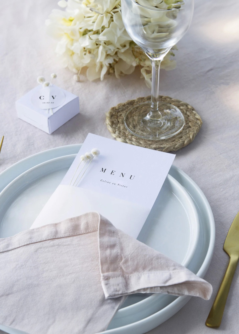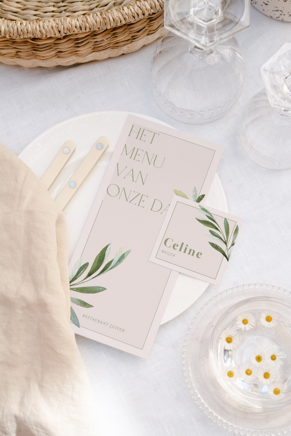"Wanneer je kiest voor een uitgeserveerd diner in plaats van een buffet, kun je menukaarten laten drukken in de stijl van jullie bruiloft. Op de menukaart moeten, volgens de etiquette, de gerechten in de volgorde van opkomst geplaatst worden." Vertelt Cotton Bird.