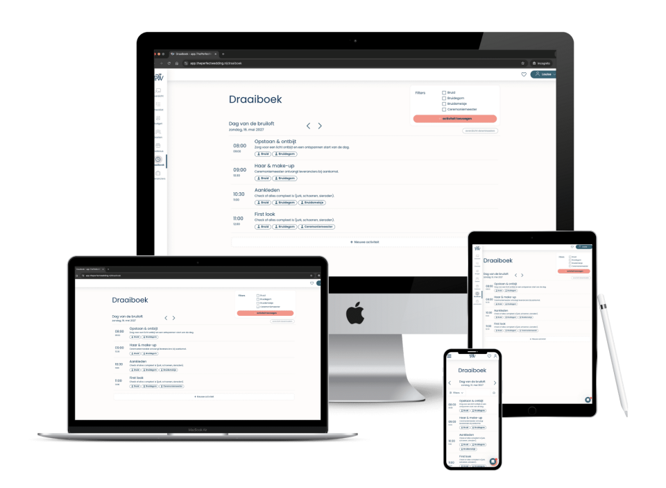 Op ThePerfectWedding.nl kun je gratis gebruik maken van onze handige planningtools. Hiermee kun je heel snel en gemakkelijk een draaiboek opstellen. We hebben de belangrijkste gebeurtenissen alvast in deze tool gezet. Je kunt deze dan zelf aanvullen met andere activiteiten en daar tijden bijzetten. Maak daarnaast notities, laat zien wie verantwoordelijk is voor welk onderdeel én download het draaiboek als PDF! Met je gratis account kan je ook meteen jullie budget bijhouden, inspiratieborden maken, de gastenlijst opstellen en een superhandige online cadeaulijst maken.