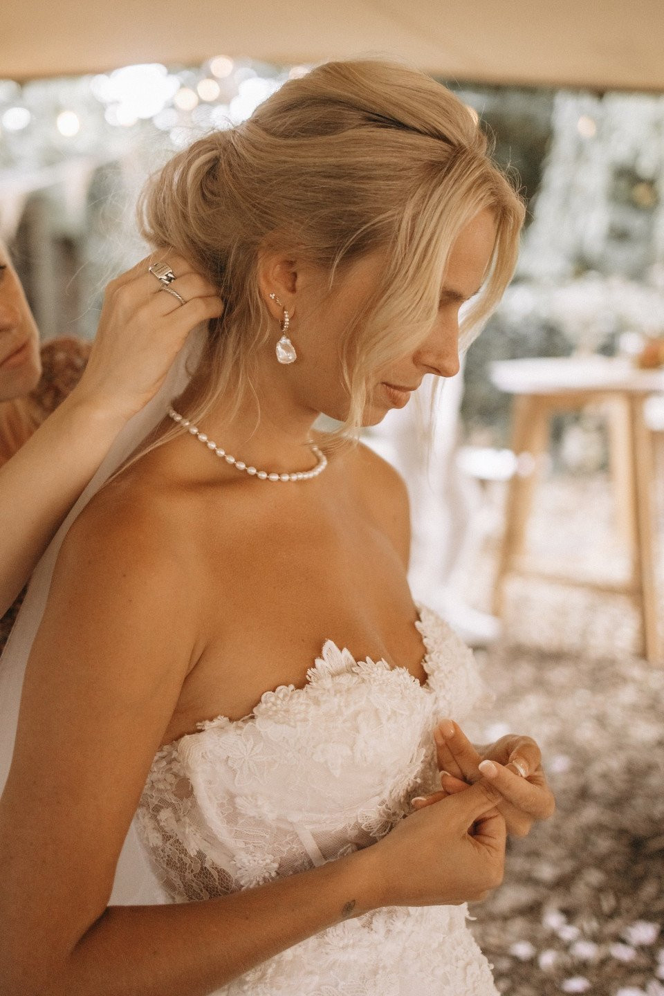 Oorbellen zijn niet de enige bruidsaccessoires die je zult dragen op de grote dag. Na het jawoord mag je in ieder geval ein-de-lijk die schitterende trouwring om je vinger schuiven! Maar welke sieraden draag je als bruid nog meer? That's up to you! Oorbellen, een ketting, armbanden en haarsieraden, er zijn opties genoeg! Let wel op dat de sieraden in balans zijn met elkaar. Als je kiest voor een collier met veel bling, zorg er dan voor dat jouw oorbellen wat meer ingetogen zijn. Bij bruidsmodezaken kun je vaak mooie sets van bruidssieraden kopen, maar dat is niet per se nodig. Mix & match jouw sieraden van verschillende merken om een unieke look te creëren!