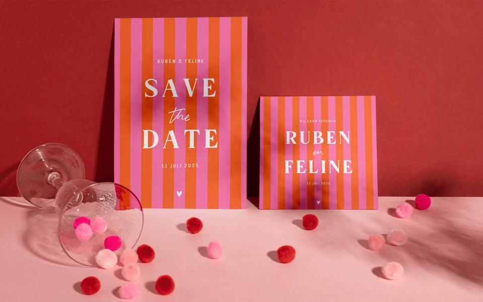 Soft en safe? Niet als het aan deze trend ligt. Feest van kleur is bold, speels en lekker out of the box. Ideaal voor stellen die niet bang zijn om op te vallen en die willen dat hun kaart net zo kleurrijk is als hun liefdesverhaal.