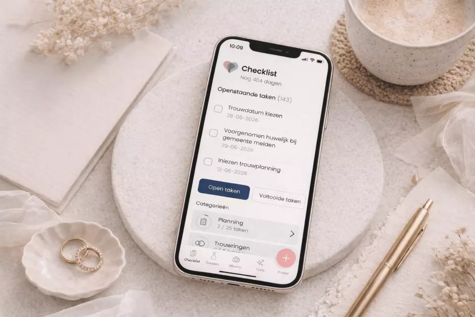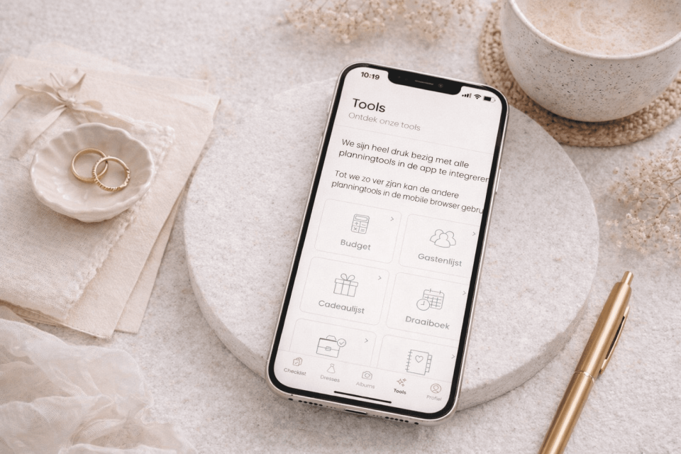 Naast de checklist vind je in de app nog veel meer handige tools die jouw trouwplanning overzichtelijk, leuk én persoonlijk maken. Alles werkt samen en is gekoppeld aan je account. Je hoeft dus nooit meer in losse Excelletjes te rommelen of eindeloos terug te scrollen in je notities.