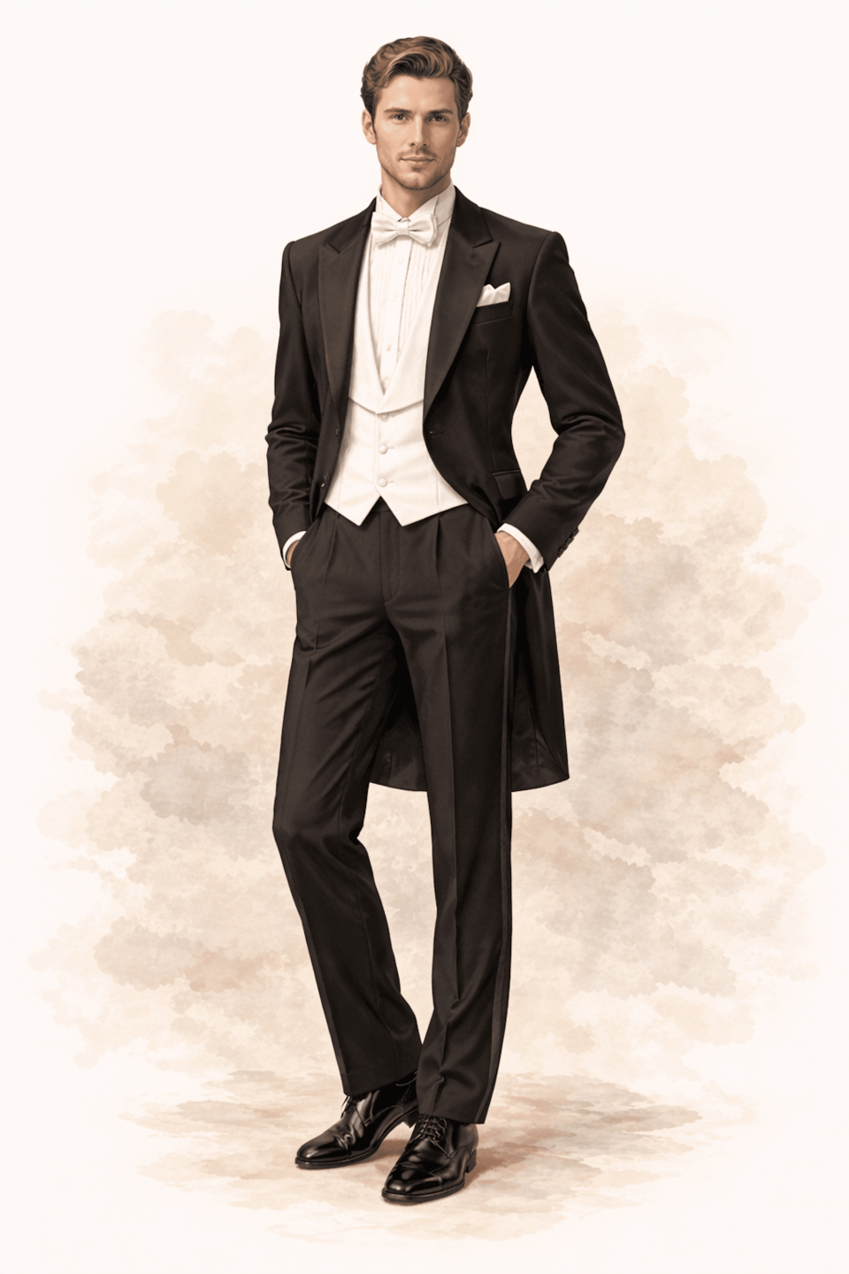 De white tie dresscode betekent dat gasten zich uiterst formeel en volgens traditionele etiquette kleden. Het is de meest chique en strikte dresscode, waarbij er weinig ruimte is voor interpretatie. Voor vrouwen betekent dit meestal een lange avondjurk tot op de grond. Voor mannen is een rokkostuum verplicht, inclusief wit strikje, wit vest en vaak lakleren schoenen. Alles draait om perfectie, klasse en een verzorgde uitstraling. White tie is niet “ongeveer netjes”. Het is all-in op elegantie.