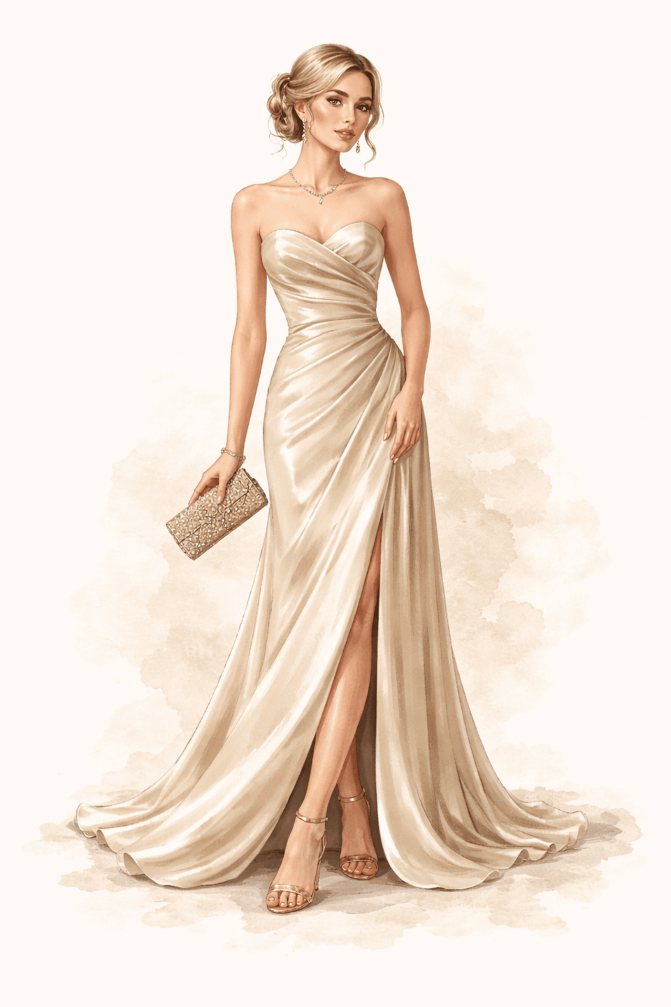 Een lange avondjurk is een must. De jurk hoort tot op de grond te vallen en gemaakt te zijn van luxe stoffen zoals zijde, satijn of chiffon. Hoe eleganter de stof en afwerking, hoe beter. Denk aan een strapless jurk, een model met open rug of juist een jurk met lange mouwen voor een klassieke uitstraling. Ook jurken met subtiele glans, borduursels of lichte bewerking passen perfect binnen deze dresscode. Kortere jurken zijn bij white tie simpelweg geen optie.