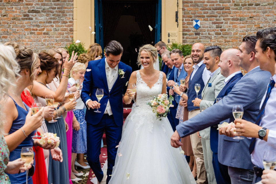 Je begint relaxed in de bibliotheek, terwijl de spanning opbouwt. Ondertussen arriveren de gasten en worden ze feestelijk ontvangen in de Blauwe Salon voor de ceremonie. Willen jullie ook een kerkelijke inzegening? Dat kan gewoon in het pittoreske kerkje tegenover het kasteel. Na de toast met bubbels schuift iedereen aan voor het diner in de indrukwekkende Ridderzaal of buiten, onder de avondzon. En als het feest losbarst, zorgt de cocktailbar, swingende band en late night snack voor die ultieme summer night vibe.