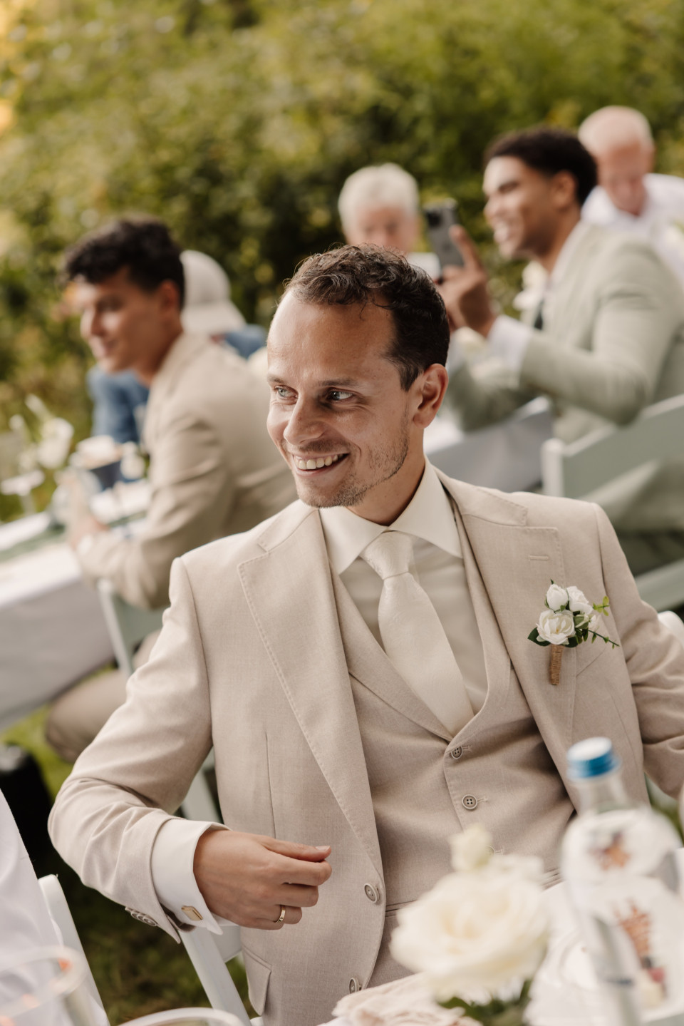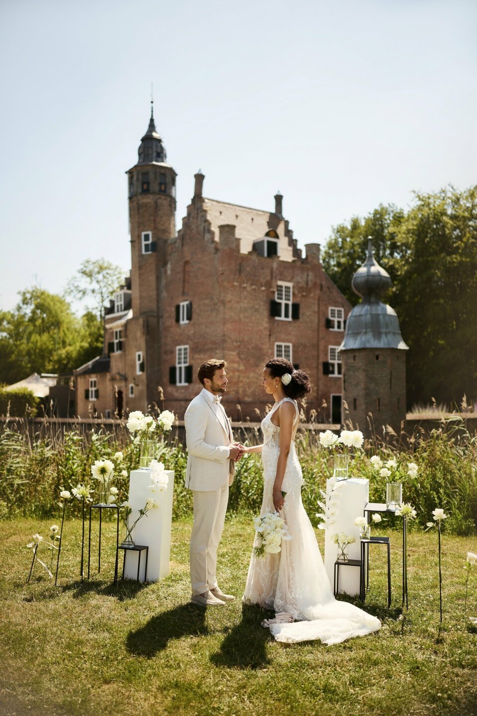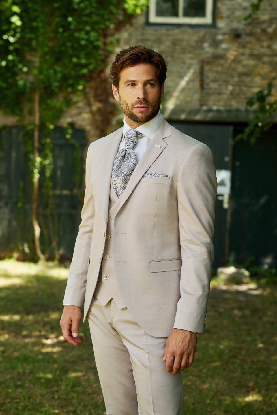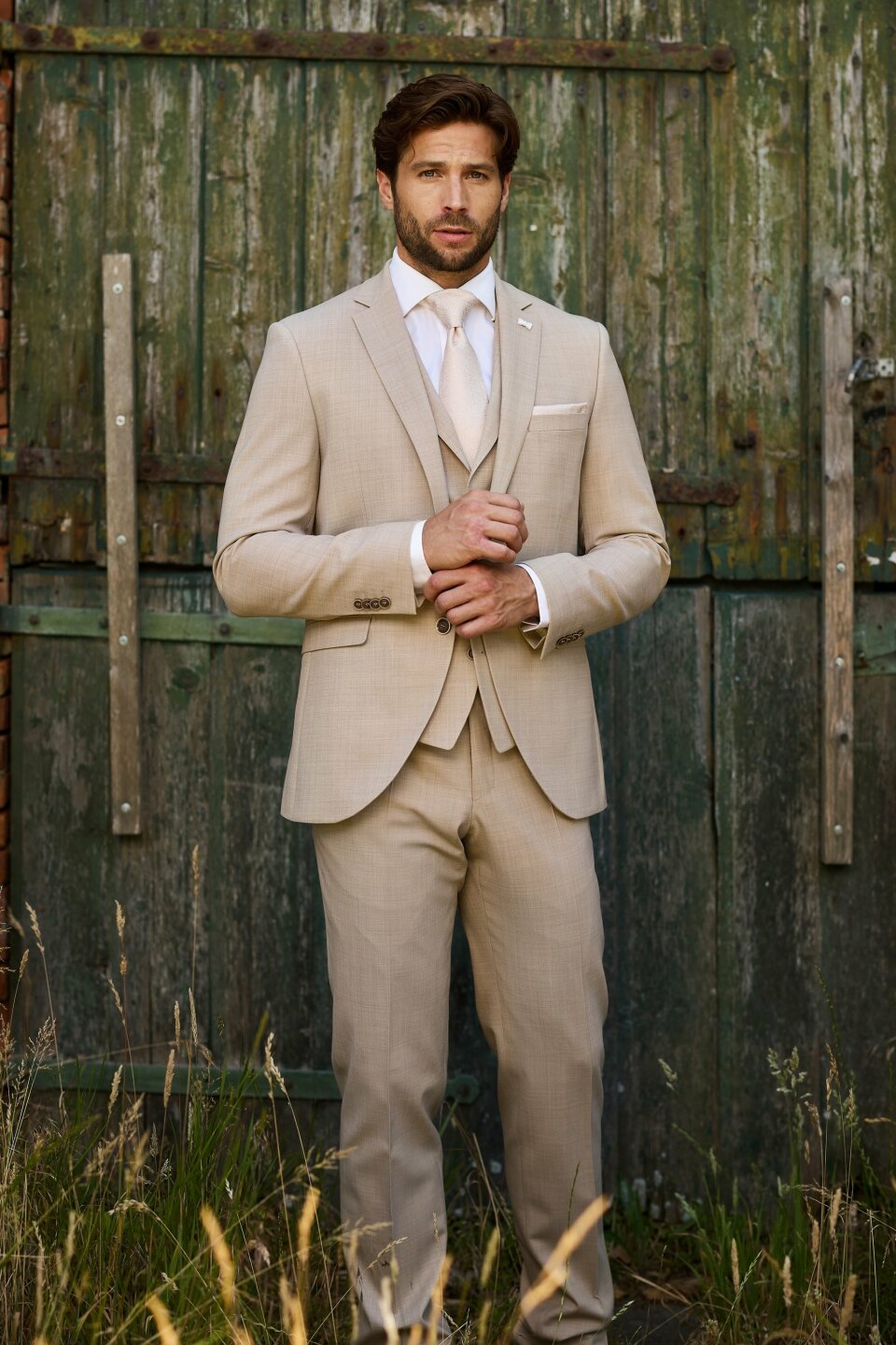 Van een strandbruiloft met je voeten in het zand tot een fancy kasteel ceremonie. Beige werkt overal! Combineer het pak met suède loafers voor een laid-back feel of kies voor glanzende leren schoenen als je all-out chic wilt gaan. “Met accessoires kun je een beige pak helemaal eigen maken”, tipt Hans. “Een simpele das en nette schoenen voor chic, of een linnen overhemd en suède schoenen voor casual.”