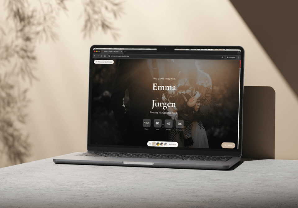 Een bruiloft website is geen extraatje, het is je grootste wedding lifesaver. Het bespaart je niet alleen stress, het maakt jullie bruiloft ook een stuk persoonlijker. Wij raden bruiloft.site aan voor het maken van jullie trouwwebsite — een platform dat speciaal hiervoor is gebouwd. Hieronder zie je precies wat je er allemaal mee kunt.