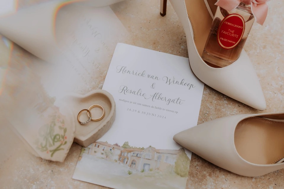 - Lever referenties aan: Foto’s van de trouwlocatie, jullie als koppel of andere elementen die in de illustratie verwerkt mogen worden.