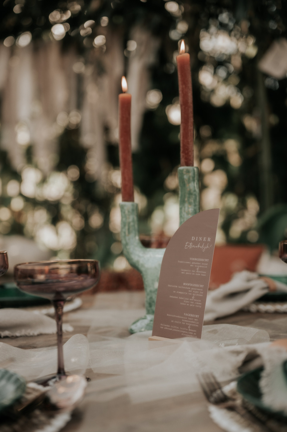 Bij een avondbruiloft draait alles om licht. Dat bepaalt de sfeer, de uitstraling én de foto’s. Combineer zacht kaarslicht met kleine lampjes of spots, zodat het sfeervol blijft maar niet te donker.