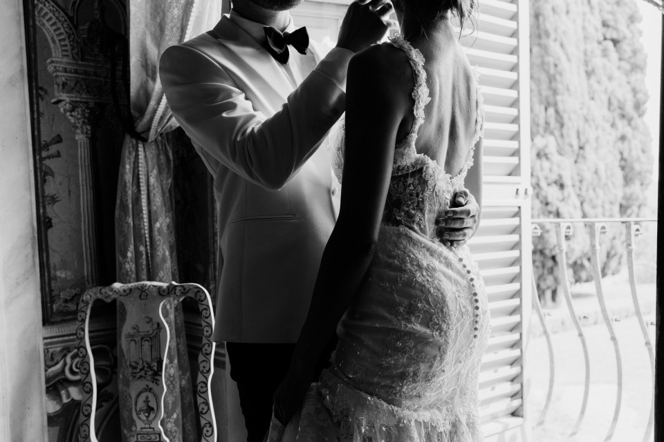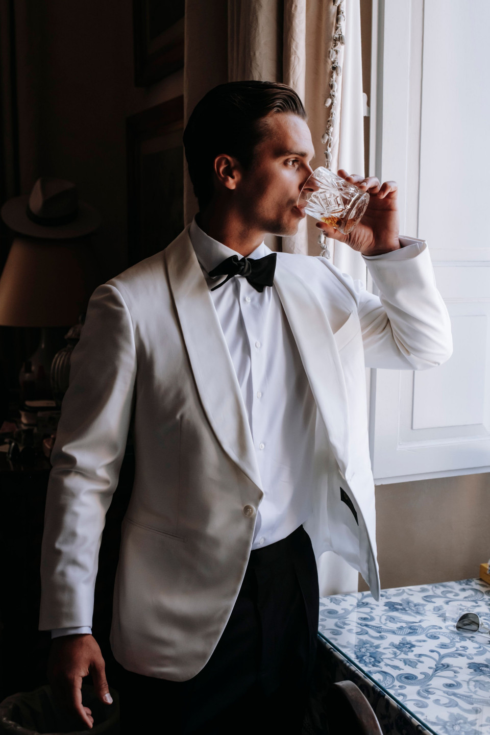 - Wit of crème jasje met zwarte broek – perfect voor een zomerse of mediterrane bruiloft. Denk aan amalfi-vibes meets James Bond.