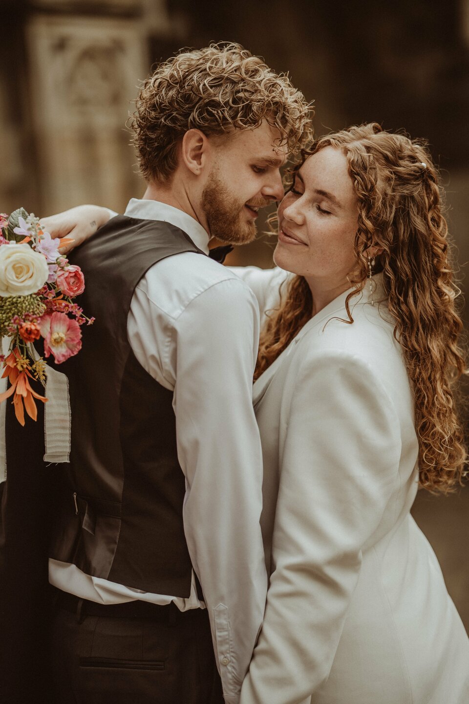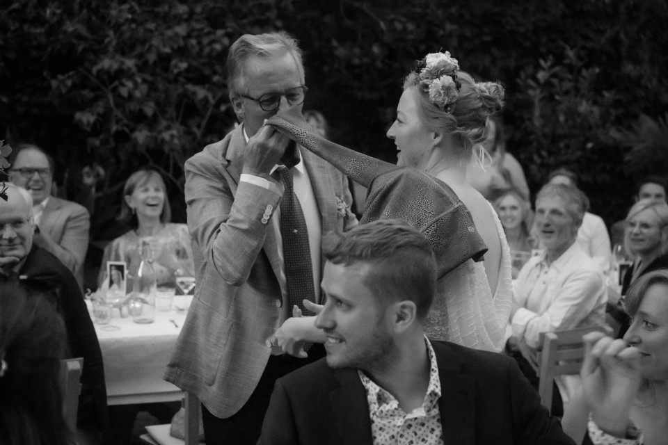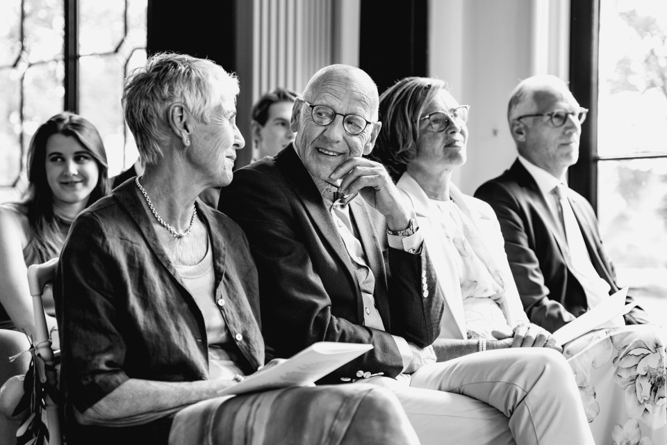 Gelukkig niet. De meeste trouwfotografen kiezen juist bewust voor een mix en bepalen per foto wat het sterkst werkt. Zij weten precies wanneer kleur de sfeer draagt en wanneer zwart-wit meer indruk maakt. In een gemiddelde reportage is zo’n 10 tot 20 procent zwart-wit, perfect om die extra laag aan emotie toe te voegen, zonder dat je de kleuren van jullie dag mist. Zo krijg je het beste van beide werelden: beelden met een tijdloos randje én foto’s waarin je het kleurpalet van jullie bloemen, styling en feestverlichting weer helemaal terugziet. Helemaal zoals het was!