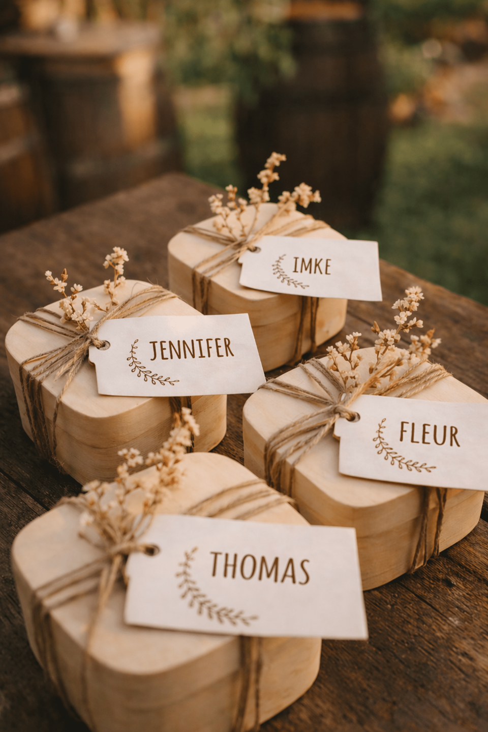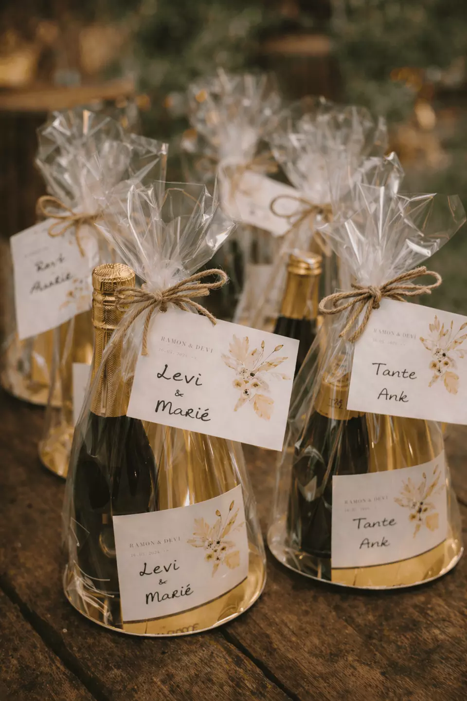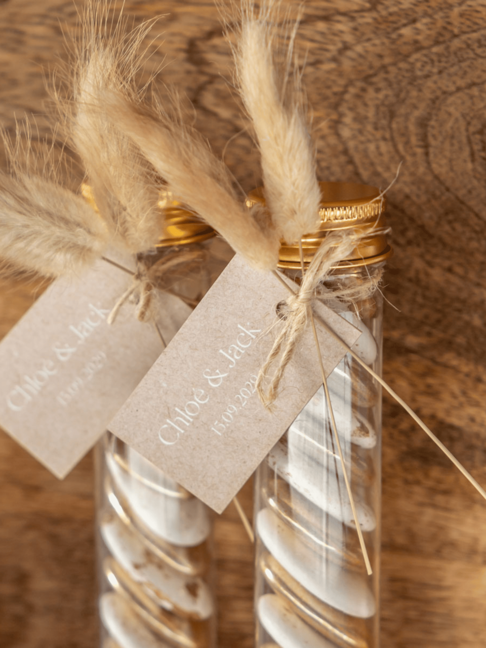 Het geheim van een goed huwelijksbedankje zit ’m niet in de prijs, maar in het gebaar. Door kleine details toe te voegen, maak je zelfs het simpelste cadeautje bijzonder. Ga dus verder dan alleen een label met jullie namen. Denk bijvoorbeeld aan een mini kaartje met een persoonlijke boodschap per tafel, net even anders voor je familie dan voor je vriendengroep. Of verwerk een quote uit jullie favoriete serie, de songtekst van dat ene nummer waar jullie altijd op dansen of de coördinaten van de plek waar jullie elkaar hebben ontmoet. Wil je het nog persoonlijker? Speel in op wie je gasten zijn. Geef je oma dat ene koekje dat je vroeger altijd samen bakte, of verwerk subtiel een inside joke voor je beste vrienden. Het hoeft niet groot of ingewikkeld te zijn, als er maar echt goed over nagedacht is!