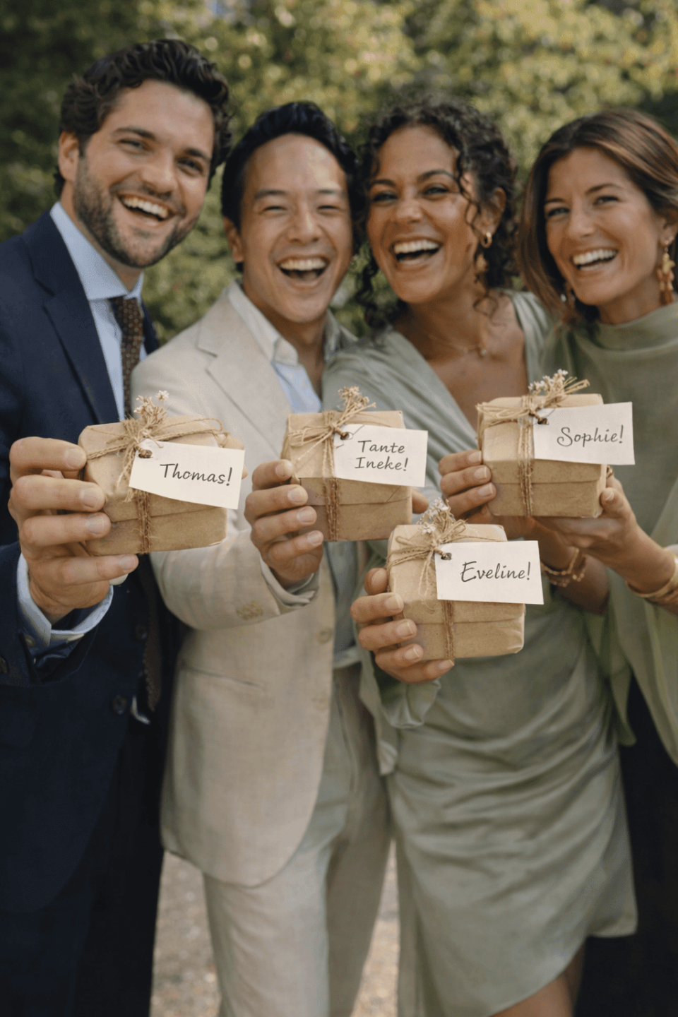 Trouwen jullie bijvoorbeeld in een Italiaanse setting, met lange tafels, veel groen en shared dining? Denk dan aan kleine flesjes olijfolie, een kruidenmix of een mini potje tapenade met een label in jullie stijl. Ga je voor een festival wedding? Dan kun je daar echt mee spelen. Denk aan kleurrijke waaiers (perfect als het warm is én meteen een vibe), zonnebrillen, bandana’s of kleine snackzakjes voor later op de avond.