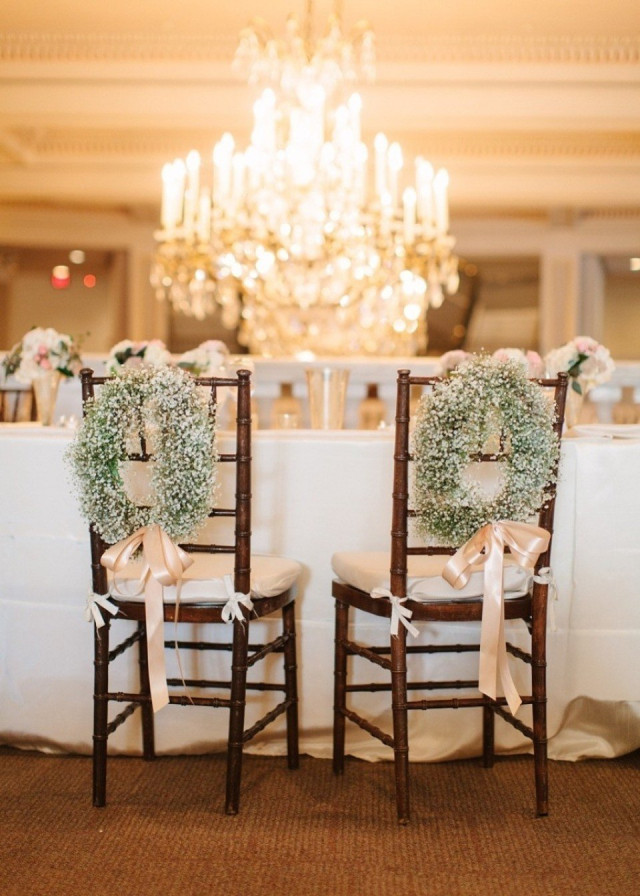 Al gedacht aan kransen als bruiloftsdecoratie? Kies je favoriete bloemen voor in de krans en hang ze aan de stoel!