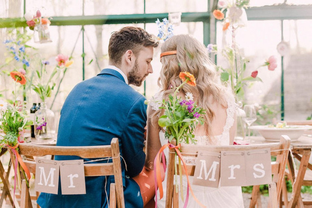 Flower power! Ga voor jouw lievelingsbloemen en hang deze ter decoratie aan de stoelen. Ook leuk is om te kiezen voor dezelfde bloemen als in jouw bruidsboeket.