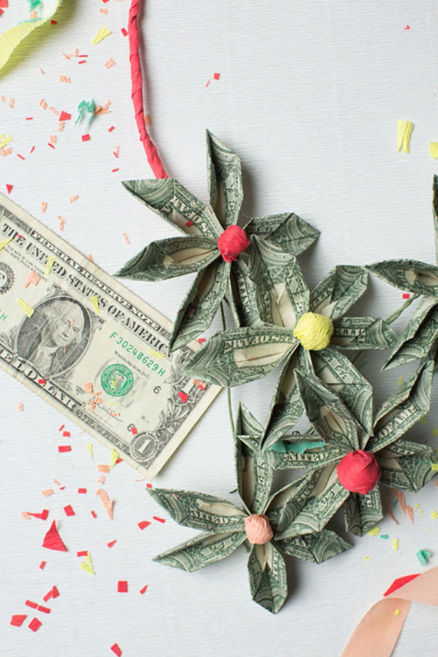 Vaak vragen de bruid en bruidegom om geld, maar dat is zo saai om te geven. Dit is niet het geval als je het een beetje leuk verpakt! Maak bijvoorbeeld een ketting van briefjes geld. ook leuk: bloemen van geld aan een koort!