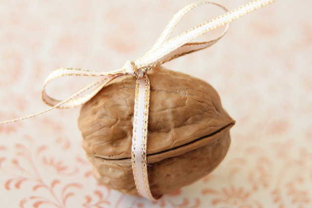 Mocht je een klein huwelijkscadeau hebben, dan is het vaak lastig om deze leuk in te pakken. Doe de gift bijvoorbeeld in een walnoot. Dat is meteen ook een leuke manier om geld te geven! De walnoot kun je zelf nog helemaal versieren met lintjes of verf.