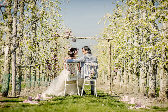 In de lente komt de natuur tot leven en de bloesembomen die bloeien geven dat heerlijke gevoel van een nieuw begin. Dat is precies wat deze prachtige styled shoot uitstraalt! En zeg nou zelf: een mooiere setting dan een prachtige boomgaard in volle bloei kan je toch niet bedenken voor een styled wedding shoot? Wellicht een inspiratie voor je eigen bruiloft, zeker als je altijd al zou willen trouwen in een appelboomgaard...