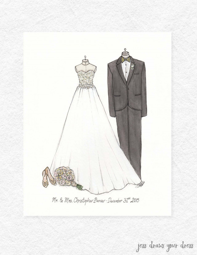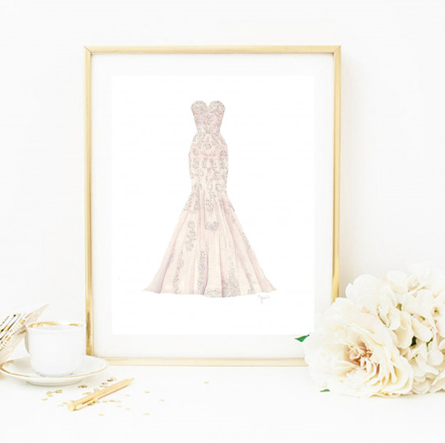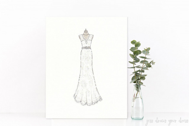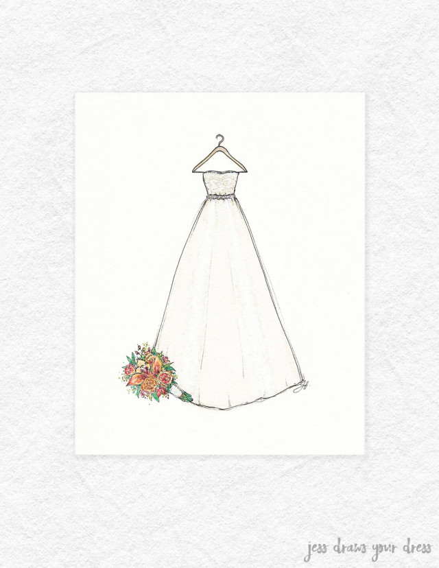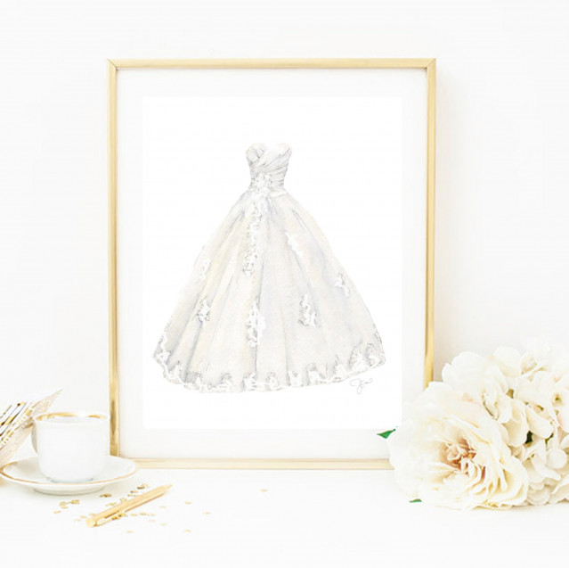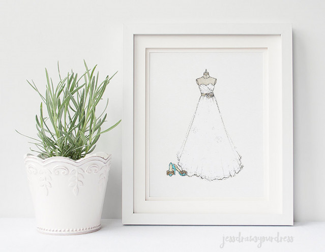 Awesomeness, jouw bruidsjurk prachtig ingelijst. En nee, dan hoef je geen lijst van 2x2 meter te kopen. Op Etsy.com vind je namelijk geweldige illustrators die van alle items op jouw trouwdag een supergave tekening maken. Zo kun je elke dag nog even wegdromen bij het zien van je trouwjurk!