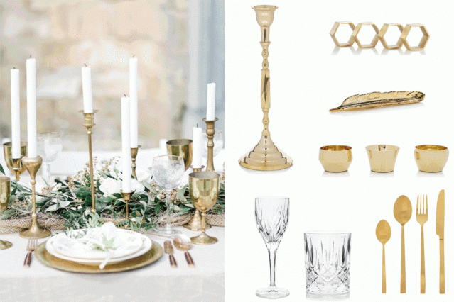 Ik hou wel van een romantisch en chic goud tintje. Het geeft direct een warme en gezellige sfeer en je kunt deze shiny color op vele manieren combineren. Ik heb 3 toffe looks voor je samengesteld; clean, romantisch en kleurrijk. Pick your favorite items, zoek er nog wat mooie linnen tafellopers en servetten bij, een paar eucalyptus takken of mooie rozen en de look is compleet!