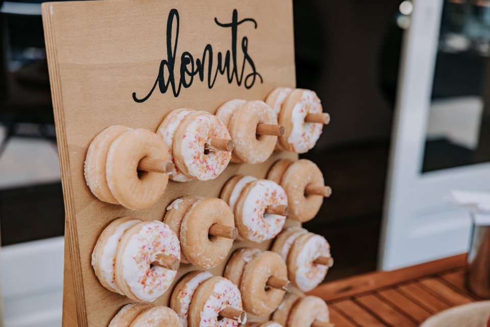 Voor de zoetekauwen mag de donut wall natuurlijk niet ontbreken. Dit idee blijft populair en is nu nog steeds een hit. Hang verschillende soorten donuts op een muur of display en laat je gasten zelf hun favoriete donut kiezen. Van klassieke donuts met suiker tot varianten met glazuur, chocolade of zelfs een vulling – succes gegarandeerd!
