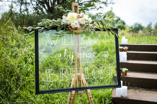 Bij het versieren van een trouwlocatie hoort het versieren van de buitenkant van de locatie er ook bij. Een leuke manier om de buitenkant te versieren en je gasten welkom te heten op de bruiloft is door een welkomstbord of banner te plaatsen. Hiermee versier je de buitenkant van de trouwlocatie en weten je gasten ook meteen waar ze moeten zijn. Ik zeg: twee vliegen in een klap!