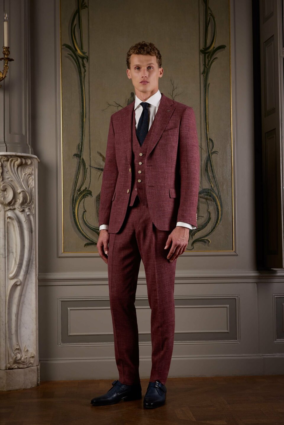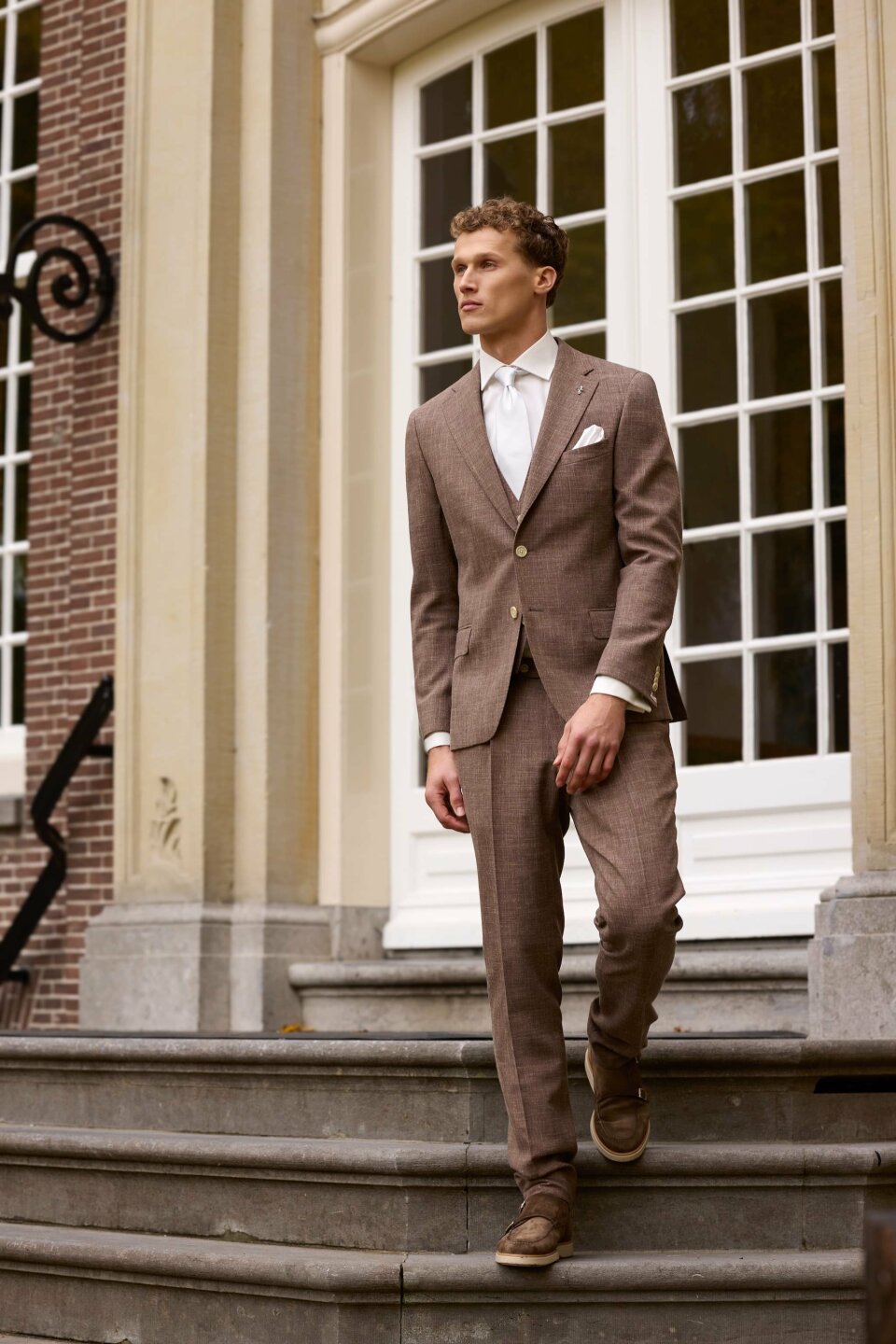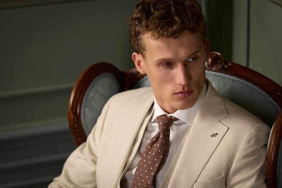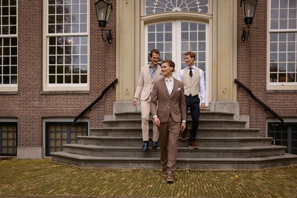 Daarnaast winnen warmere kleuren terrein. Denk aan bruin en subtiele roodtinten, variërend van licht tot donker. Deze kleuren geven trouwpakken een moderne uitstraling, zonder dat ze hun tijdloze karakter verliezen.