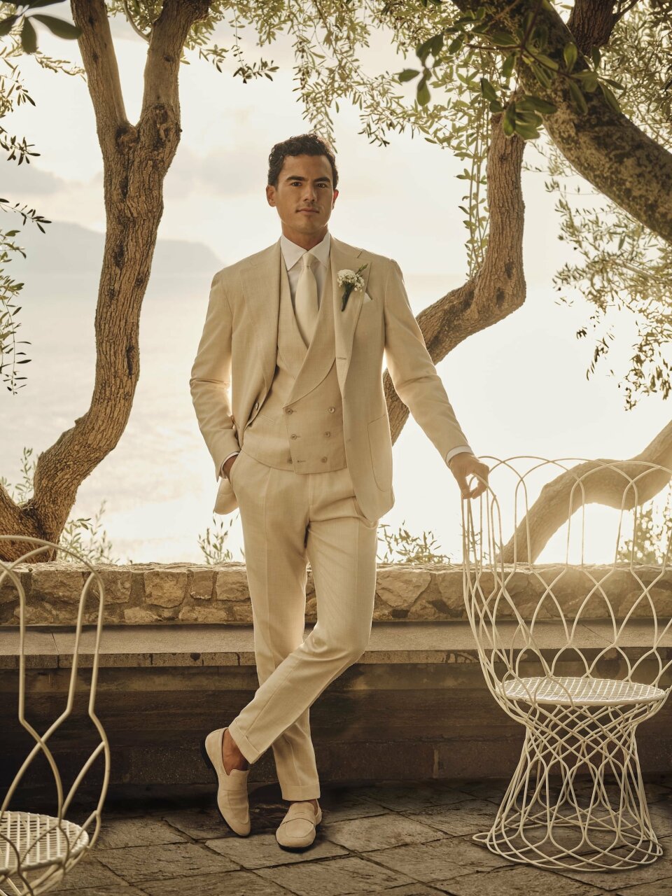 - Licht pak + ivoor overhemd + loafers