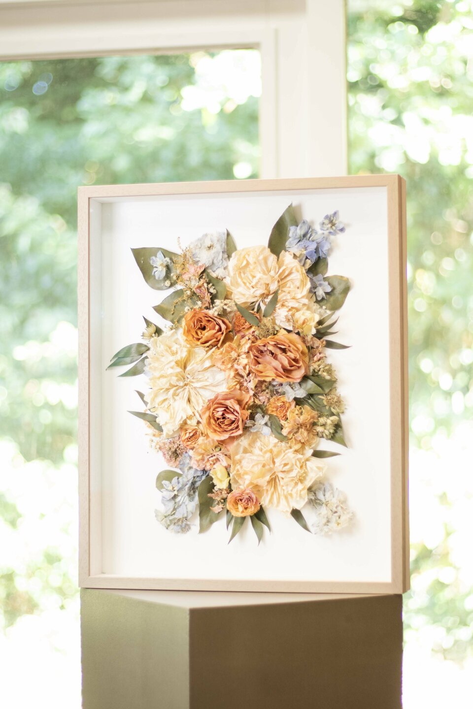 Je kunt ervoor kiezen om het boeket opnieuw te laten opmaken zoals het oorspronkelijk gebonden was, of het te laten verwerken in een klassiek en stijlvol geheel. Denk aan een lijst, een glazen vitrine, een stolp of een harsgieting waarin de bloemen als het ware voor altijd worden vastgelegd. Zelfs een trouwfoto of trouwlogo kan in het ontwerp worden verwerkt. Elk stuk is maatwerk en volledig afgestemd op jullie wensen.