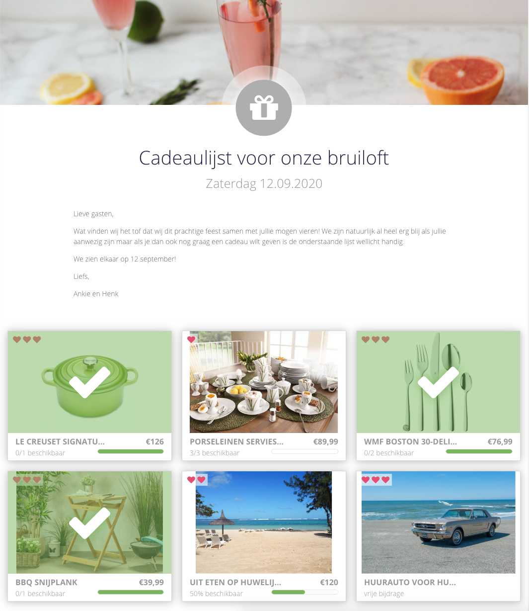 Met onze cadeaulijst wordt geld geven leuker! Vul jullie cadeau- of geldwens in en upload bijvoorbeeld een foto van een boottocht die jullie willen maken op jullie huwelijksreis. Of wat dacht je van een geldwens voor een toffe cocktailbus op de bruiloft?