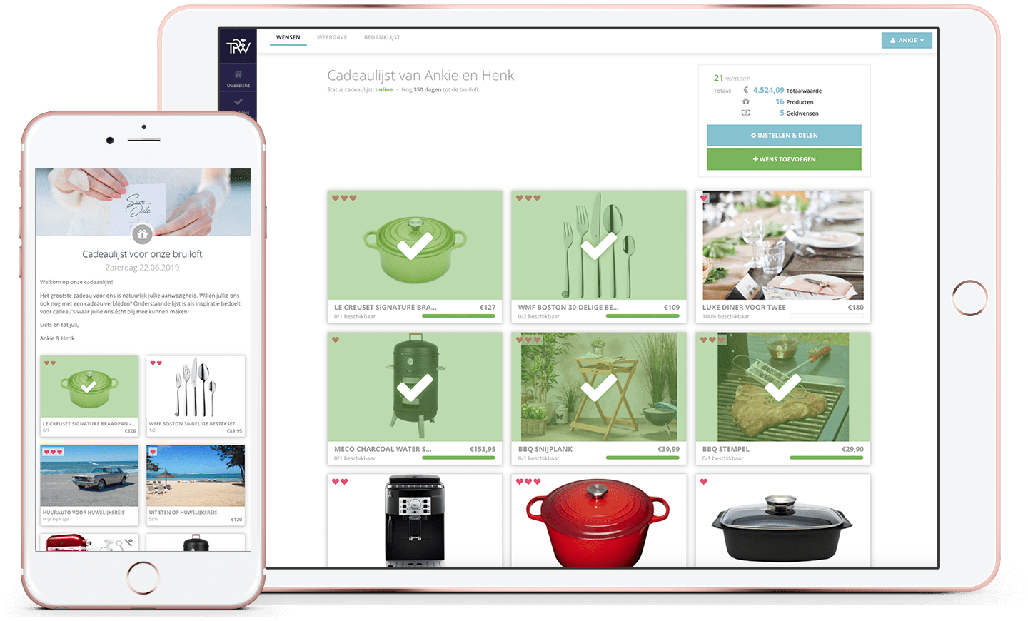 Missen jullie nog een paar items in jullie huishouden maar dromen jullie ook van een huwelijksreis naar een tropisch paradijs? Met de online cadeaulijst van ThePerfectWedding kunnen jullie deze wensen op één lijst zetten. Voeg producten toe of vraag naar een bijdrage voor bijvoorbeeld jullie huwelijksreis. Zo weten gasten precies waar hun envelopje heen gaat.