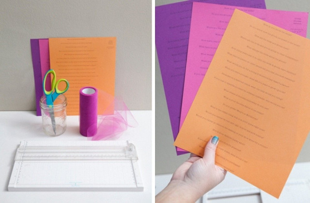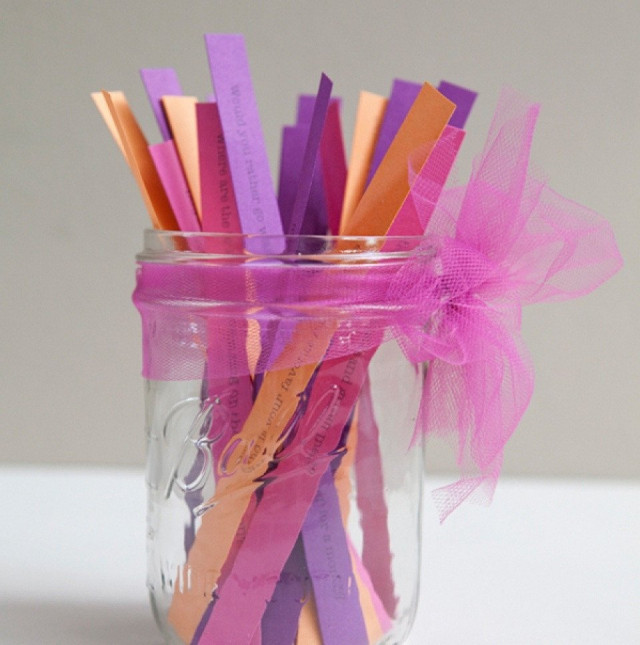 Print de vragen uit op het karton, knip ze in dunne strookjes en zet ze in de lege potjes. Met het lint maak je een mooie strik om het potje en klaar ben je.